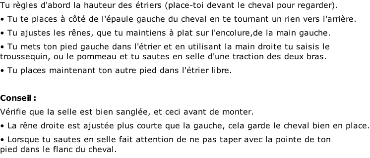 Monter correctement Tête droite Haut du corps droit Rein souple Mollets au contact talons bas genoux bien positionnés cuisses sur leur plat pouces au dessus coudes demi pliés